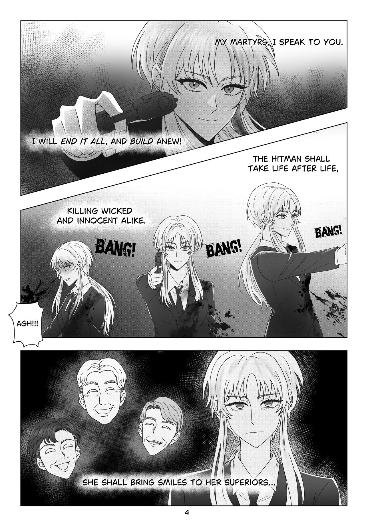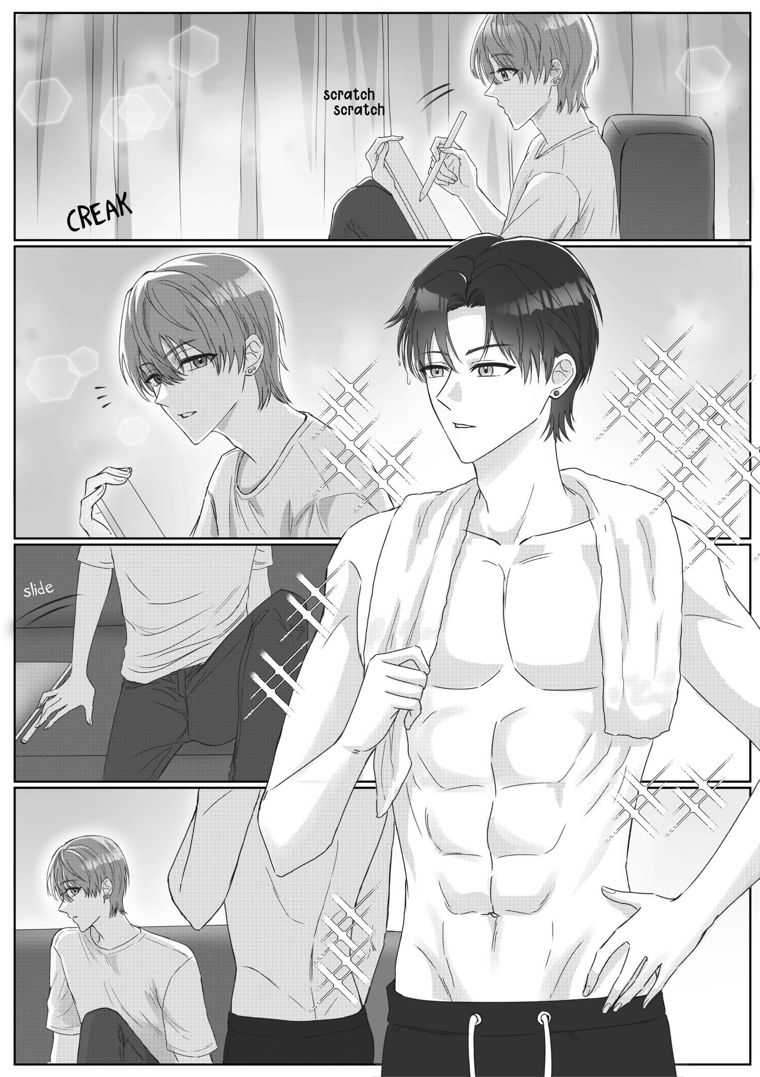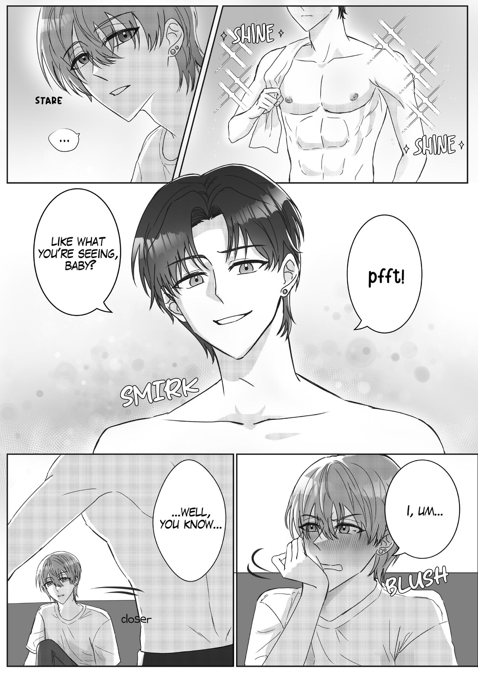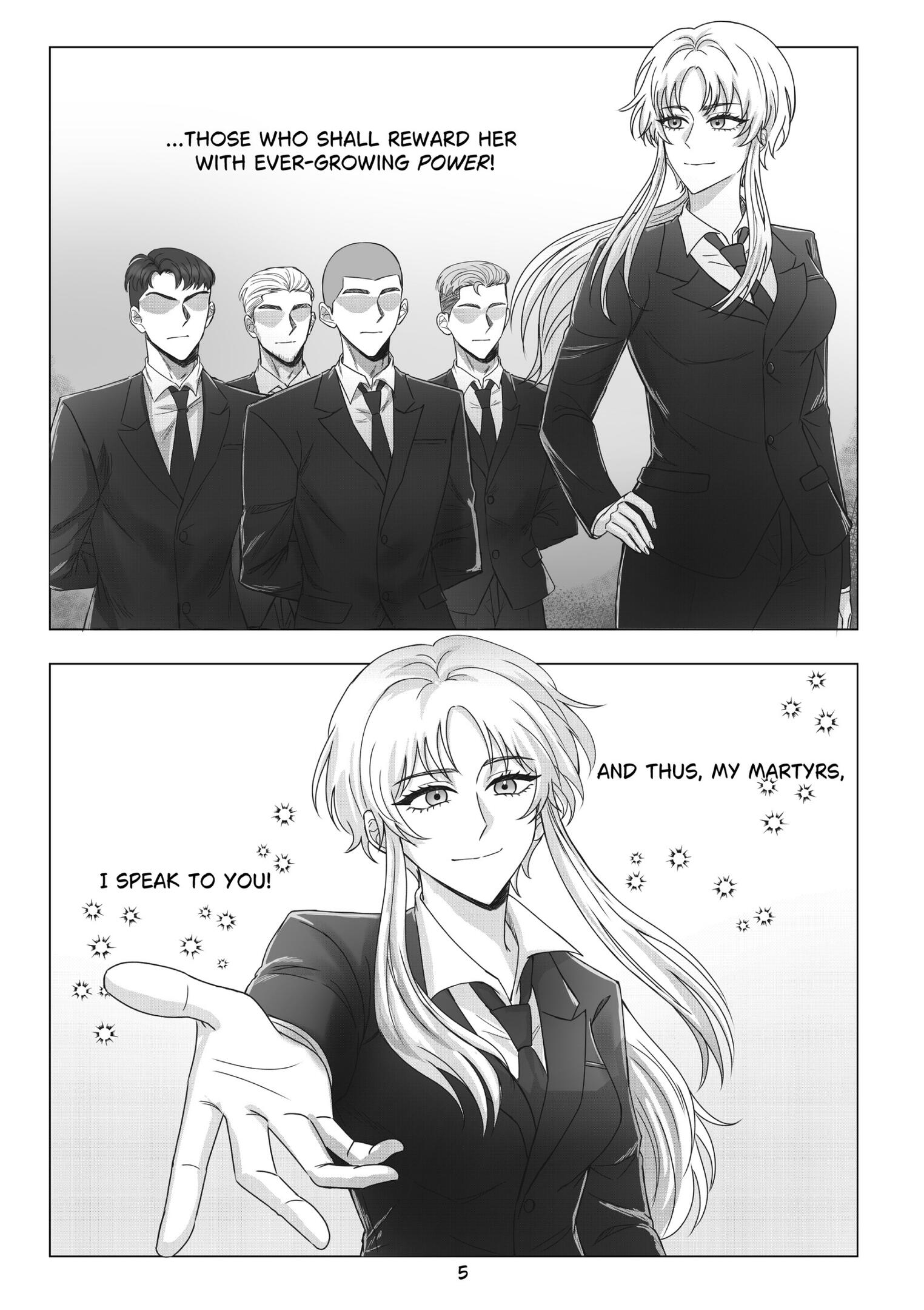 Max 5 panels with max 2 people in 1 panel include texting (effects, SFX), simple background and property.